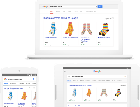 Vis produktbilder, priser og navnet på bedriften din til folk som søker på Google – uansett hva slags enhet de bruker. Du betaler bare når de klikker for å gå til nettstedet ditt.